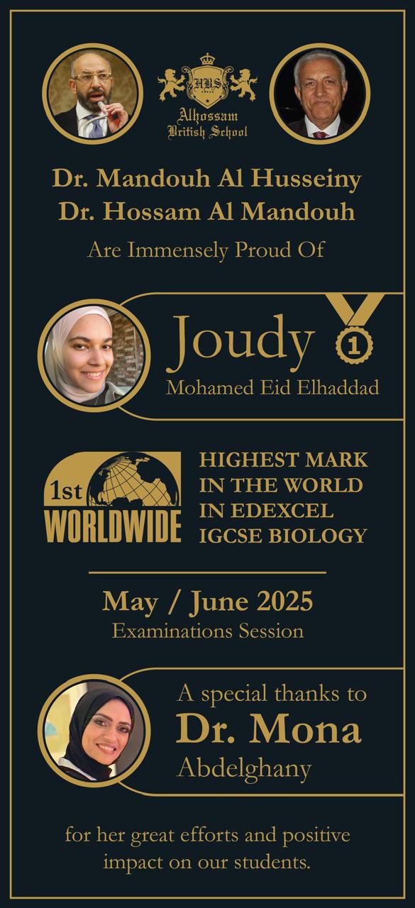 وقامت المدرسة ممثلة في الدكتور المندوه الحسيني رئيس مجلس الإدارة والدكتور حسام المندوه نائب رئيس مجلس الإدارة بتكريم الطالبة جودي محمد عيد، التي حققت أعلى درجة على مستوى العالم في مادة الأحياء في اختبارات IGCSE.