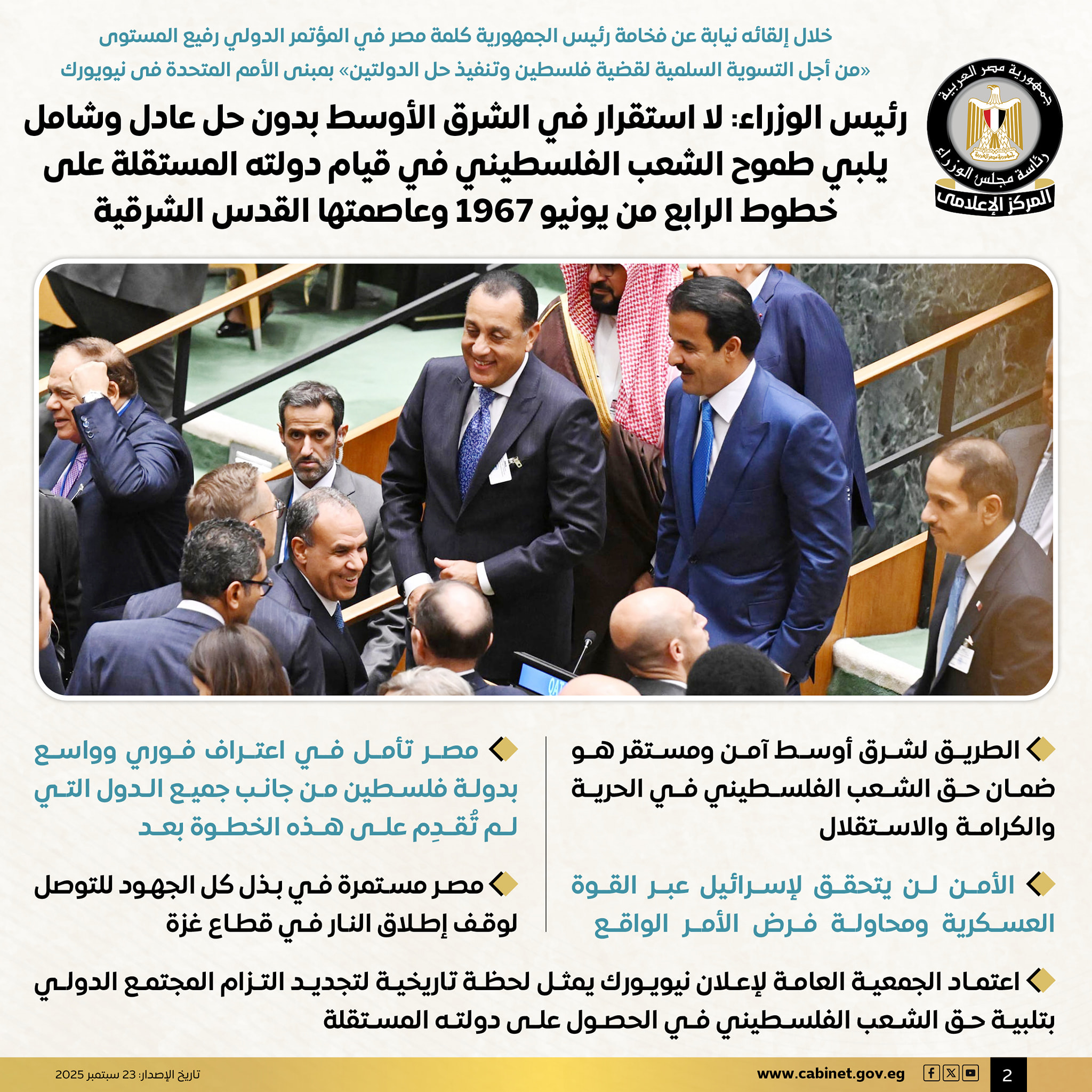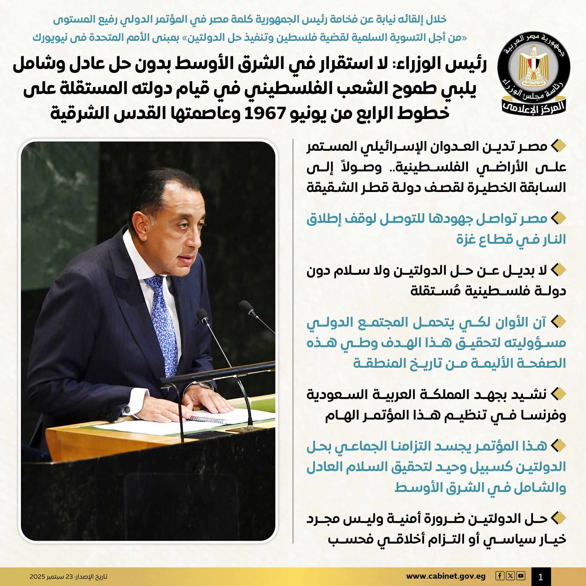 رئيس الوزراء: لا استقرار في الشرق الأوسط بدون حل عادل وشامل يلبي طموح الشعب الفلسطيني في قيام دولته المستقلة على خطوط الرابع من يونيو 1967 وعاصمتها القدس الشرقية.