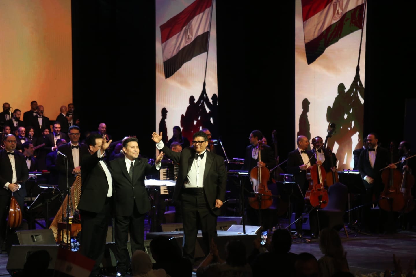 تضمنت الاحتفالية باقة من الأعمال الوطنية الخالدة التي رددها الجمهور بحماس كبير، من بينها «يابوي يا مصر» و«أهيم شوقًا» لمحمد الحلو، و«عاشت بلادنا»، «مصريتنا وطنيتنا»، «كل بلاد الدنيا جميلة»، و«مصر يا أول نور في الدنيا» للنجم محمد ثروت، و«وانت ماشي في مصر» و«بالأحضان» لهاني شاكر، إلى جانب الدويتو الشهير «بلدي» الذي جمع ثروت وشاكر، كما قدمت فرقة الموسيقى العربية مجموعة من الأغنيات والأوبريتات الوطنية منها: «الأرض الطيبة»، «أحلف بسماها»، «مصر هي أمي»، وختامًا بالنشيد الوطني الذي شارك الحضور في ترديده.