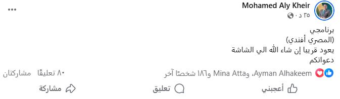 أعلن الإعلامي محمد علي خير عن عودة برنامجه الشهير “المصري أفندي” إلى الشاشة قريبًا، وذلك عبر منشور له على صفحاته الرسمية بمواقع التواصل الاجتماعي، قال فيه: “برنامجي (المصري أفندي) يعود قريبًا إن شاء الله إلى الشاشة.”