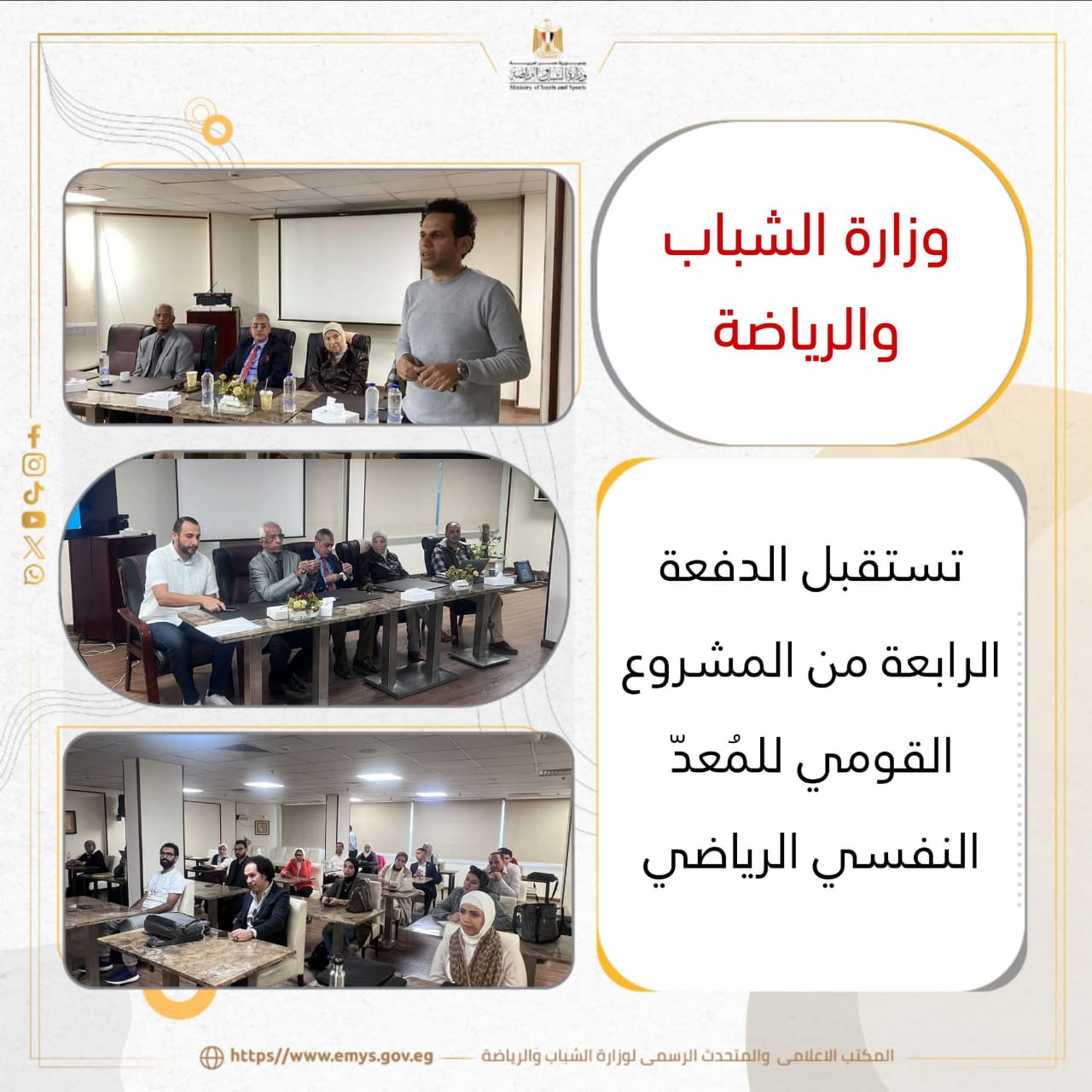 استقبلت وزارة الشباب والرياضة برعاية الدكتور أشرف صبحي الدفعة الرابعة من المتقدمين للمشروع القومي للمُعدّ النفسي الرياضي، ضمن جهود الوزارة المستمرة لإعداد كوادر مؤهلة علميًا وعمليًا تُسهم في تطوير المنظومة الرياضية المصرية ودعم سوق العمل الرياضي بكوادر متخصصة.