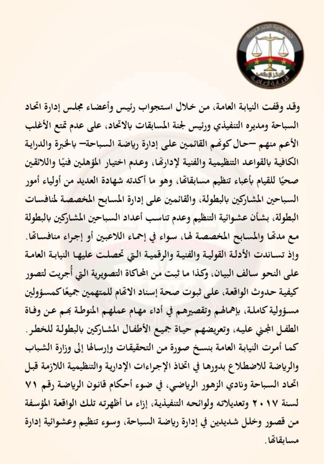 كما أمرت النيابة العامة بنسخ صورة من التحقيقات وإرسالها إلى وزارة الشباب والرياضة للاطلاع بدورها في اتخاذ الإجراءات الإدارية والتنظيمية اللازمة قبل اتحاد السباحة ونادي الزهور الرياضي، في ضوء أحكام قانون الرياضة رقم 71 لسنة 2017 وتعديلاته ولائحته التنفيذية، إزاء ما أظهرته تلك الواقعة المؤسفة من قصور وخلل شديدين في إدارة رياضة السباحة، وسوء تنظيم وعشوائية إدارة مسابقاتها.