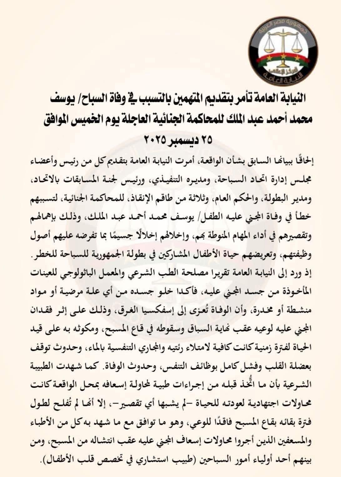أصدرت النيابة العامة بيانًا رسميًا جديدًا بشأن واقعة وفاة السباح الصغير يوسف محمد أحمد عبد الملك، كشفت خلاله عن إحالة عدد من مسؤولي اتحاد السباحة والقائمين على تنظيم البطولة للمحاكمة الجنائية العاجلة، على خلفية ثبوت الإهمال الجسيم والتقصير في أداء المهام، بما أدى إلى تعرض الطفل للخطر ووفاته، في واقعة مؤسفة هزّت الرأي العام الرياضي.