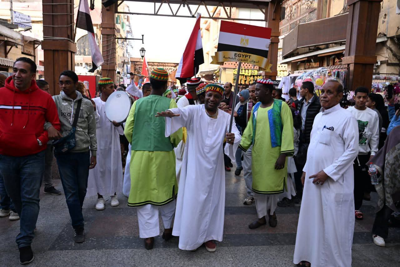 في السوق السياحي.. كرنفال استعراضي مبهج لفرق مهرجان أسوان الدولي للفنون الشعبية في دورته الـ13